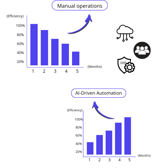 Operational improvements start appearing as soon as systems go live — especially in automation, reporting, and workflow efficiency. Larger AI-driven optimization gains 30-45 days as your data ecosystem matures.